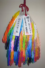 6月の「折り鶴の会」でこちらの皆さんに折っていただいた鶴は2,225羽にもなり、束ねた鶴に住職染筆の『如衆水入海一味』の短冊をつけて手渡しました。