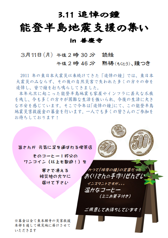 東日本大震災以来毎年行っている「3.11追悼の鐘」。今年は元旦に発生した能登半島地震被災地支援の集いも兼ねて、募金活動を行います。