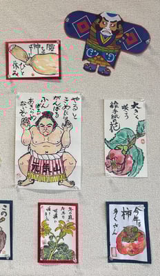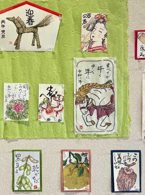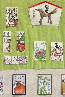 さて今年も本堂にて新年の絵手紙を展示しております。